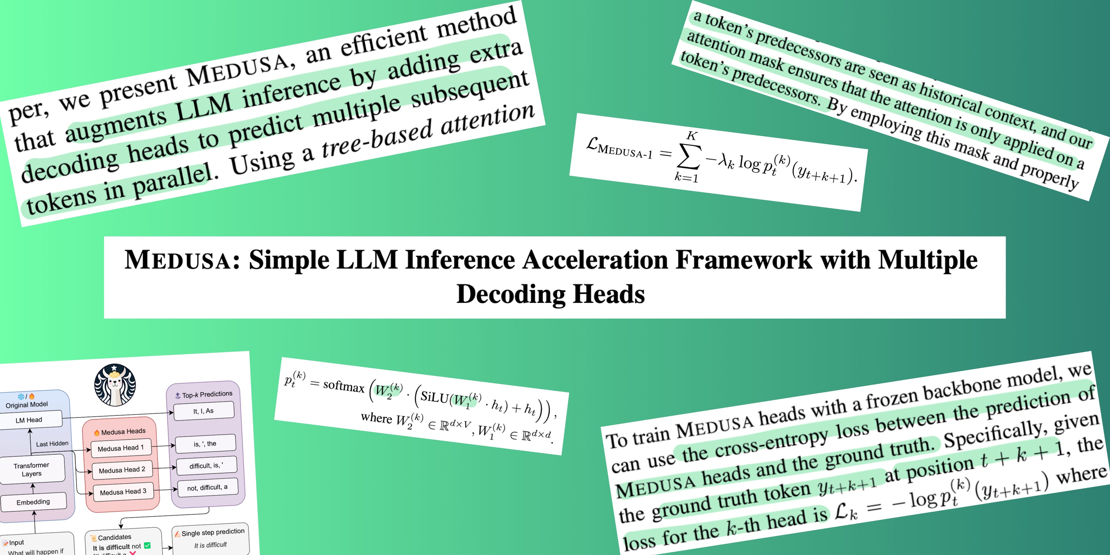 Medusa seeks to improve model inference speed by adding additional decoding heads to existing LLMs. These additional heads enable multi-token prediction and can be trained with the backbone LLM frozen, or in conjunction with the original LLM.